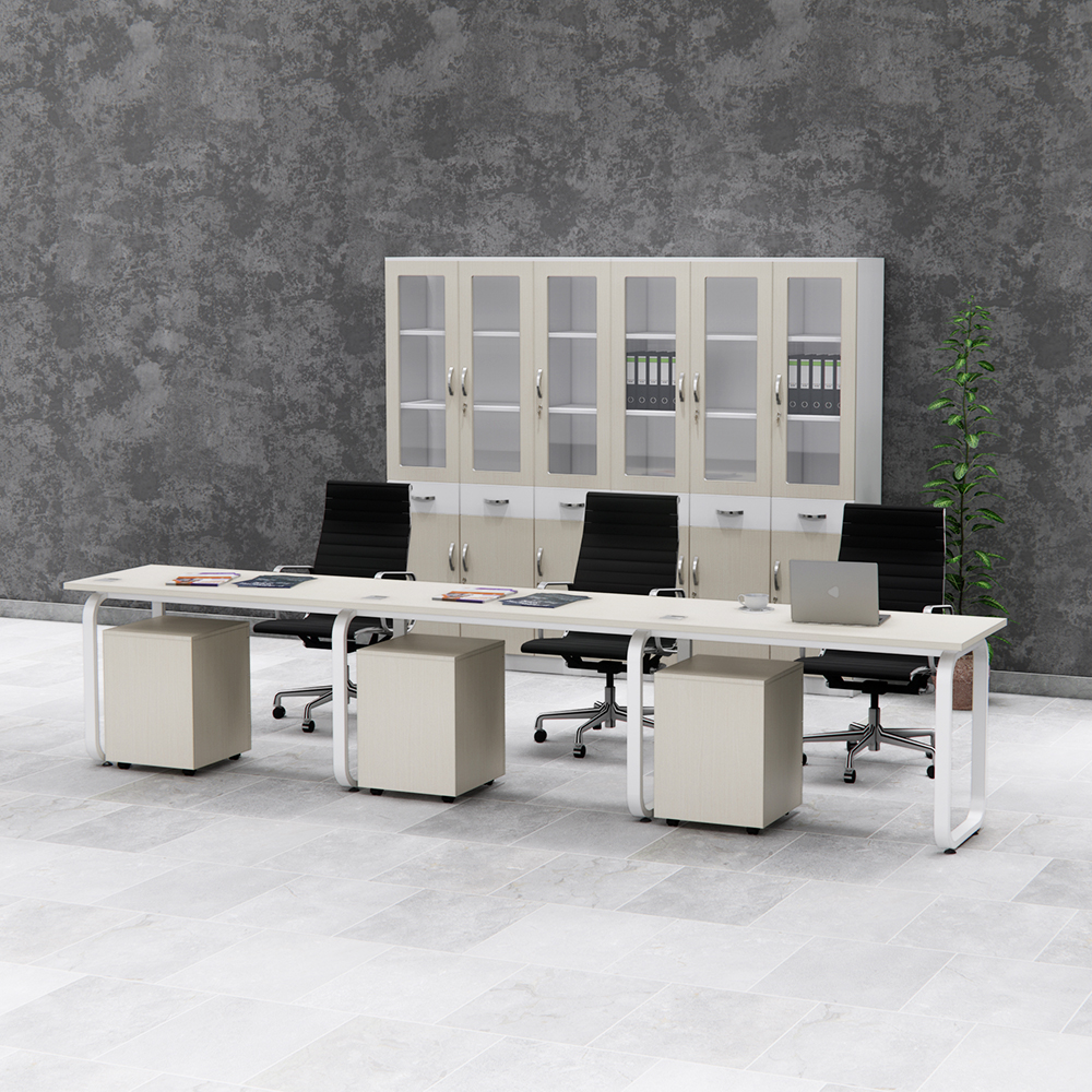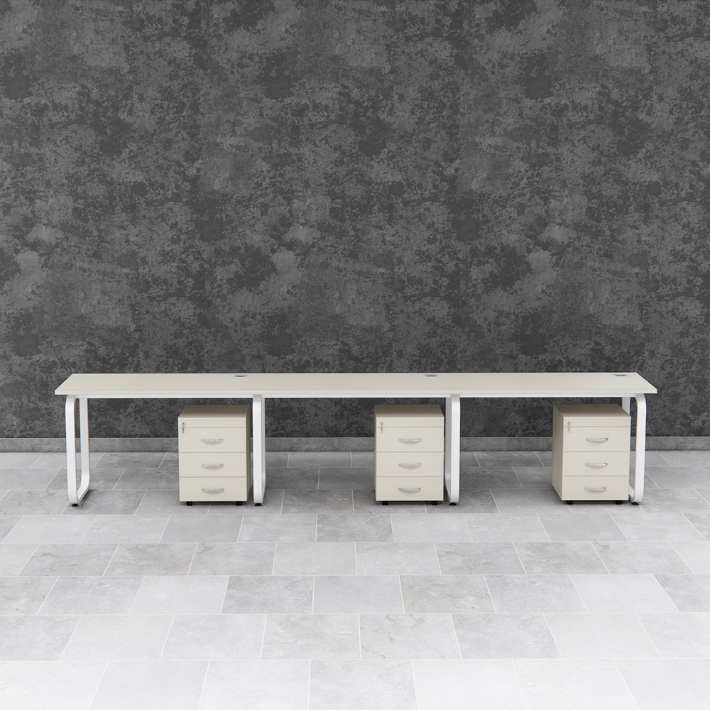 Cụm bàn được thiết kế dành cho 3 người sử dụng, bố trí theo hàng ngang giúp dễ dàng tương tác và trao đổi khi làm việc nhóm. Kiểu dáng đơn giản, chân sắt chữ U tạo cảm giác rộng rãi, phù hợp với nhiều loại hình văn phòng từ truyền thống đến không gian mở.