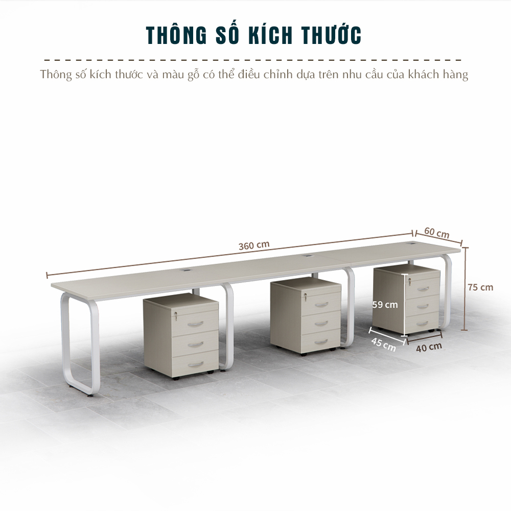 Tổng thể bàn: Dài 360 cm x Rộng 60 cm x Cao 75 cm