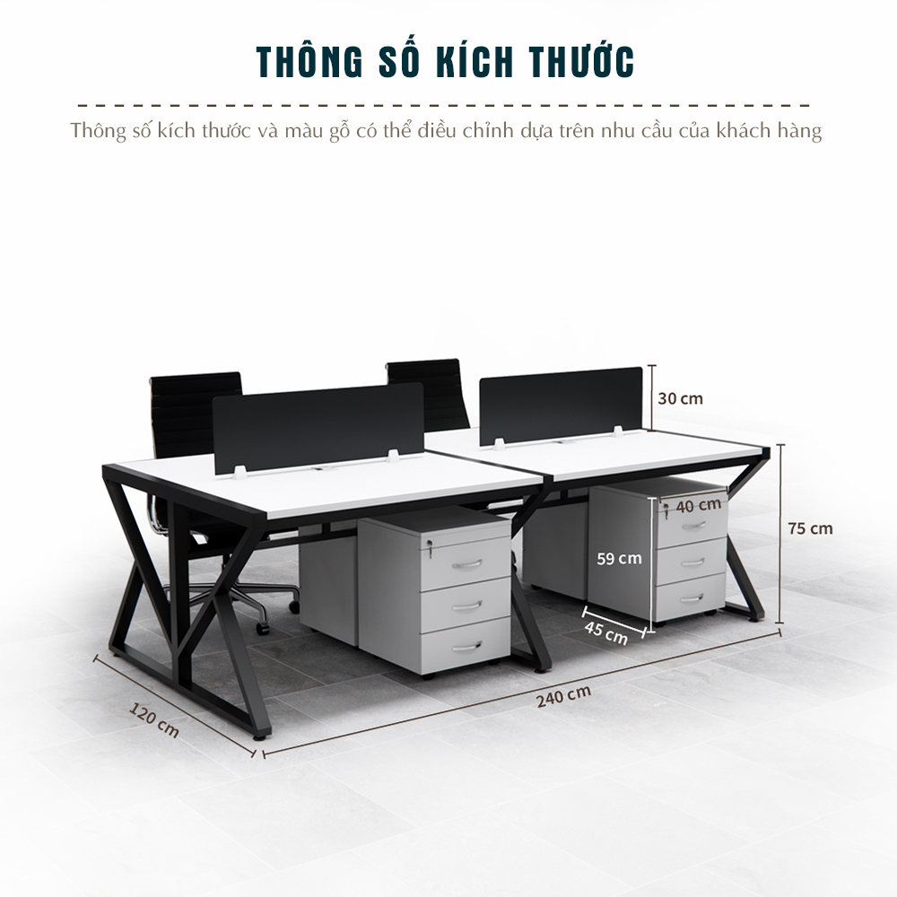Màu sắc: Mặt bàn màu trắng phối chân đen – mang lại vẻ tinh tế, sáng sủa cho không gian làm việc