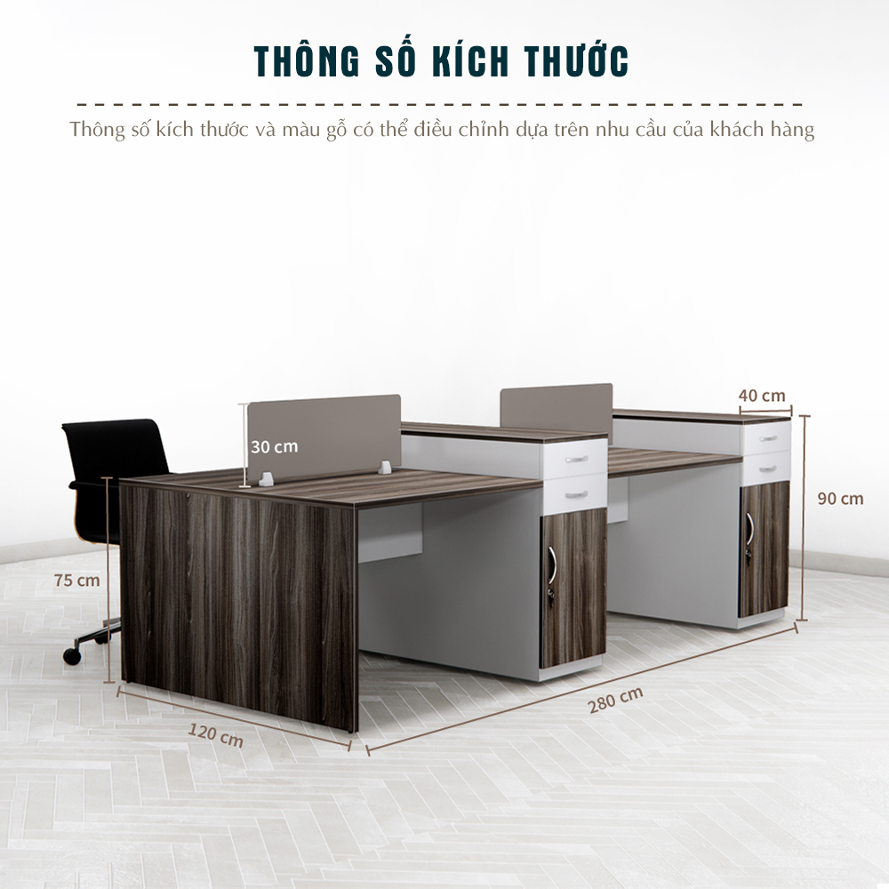 Dễ dàng lắp đặt và tùy biến: Khách hàng có thể yêu cầu thay đổi kích thước, màu sắc hoặc bố cục tủ phụ phù hợp với văn phòng.
