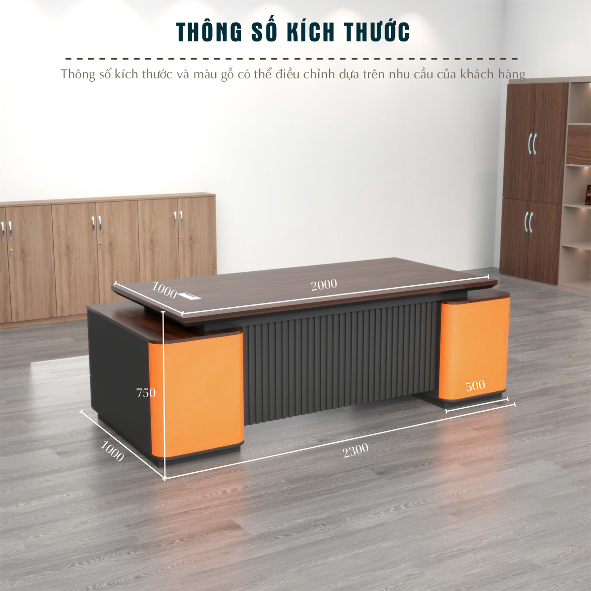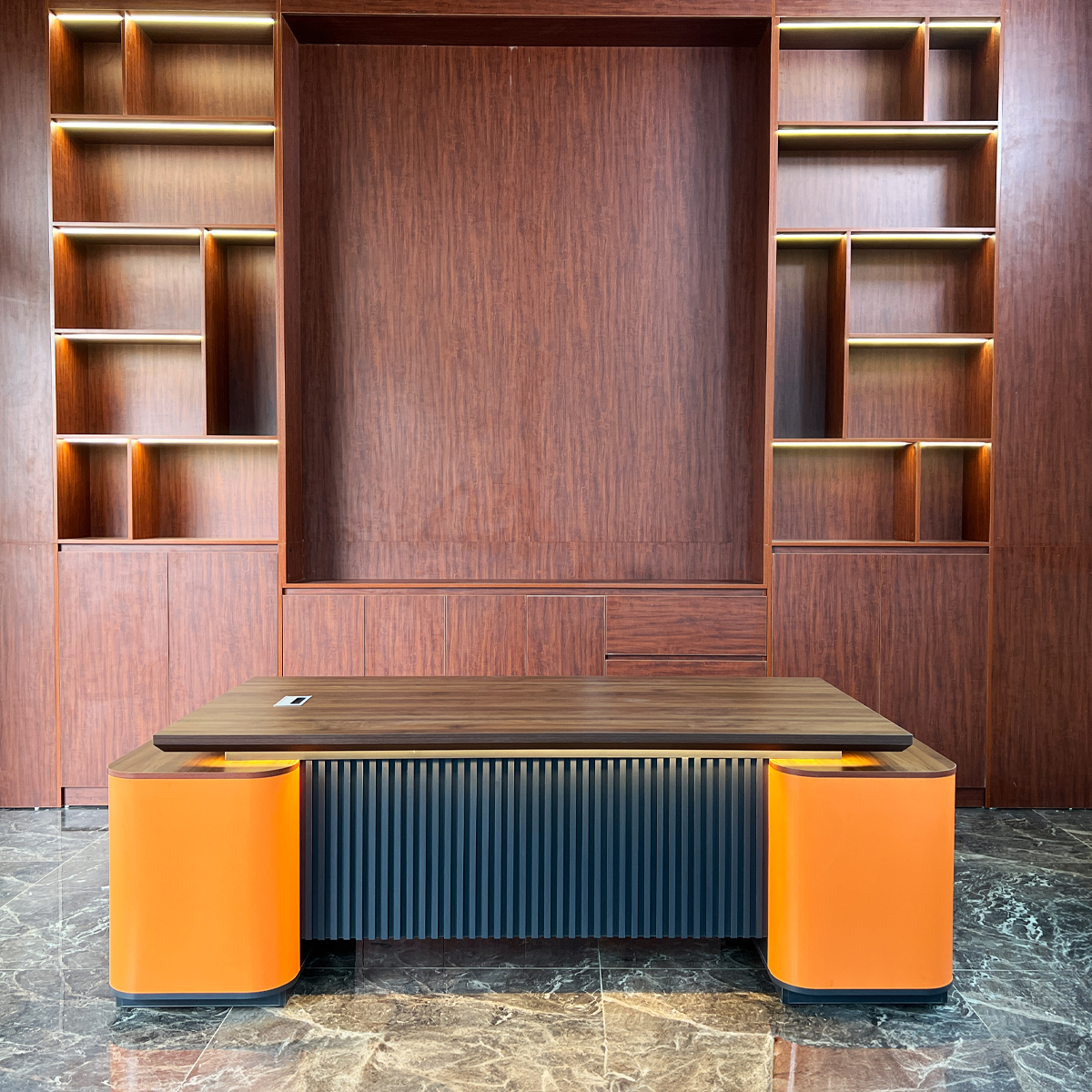 Phối màu hiện đại: Kết hợp giữa màu gỗ trầm và cam nổi bật mang lại cảm giác hiện đại, chuyên nghiệp nhưng không đơn điệu.