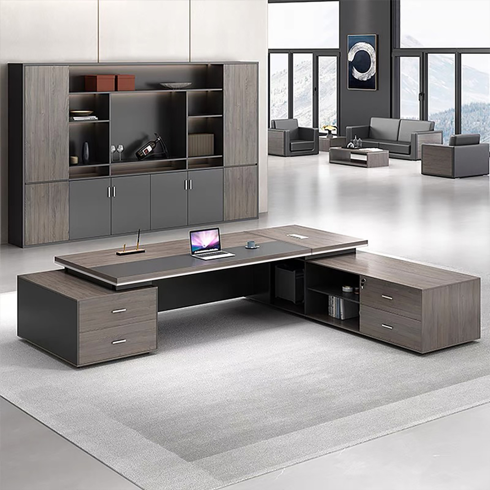 Mặt bàn rộng và tủ phụ được thiết kế liền kề giúp người dùng dễ dàng bố trí hồ sơ, máy tính, thiết bị văn phòng và đồ dùng cá nhân một cách khoa học và tiện lợi.
