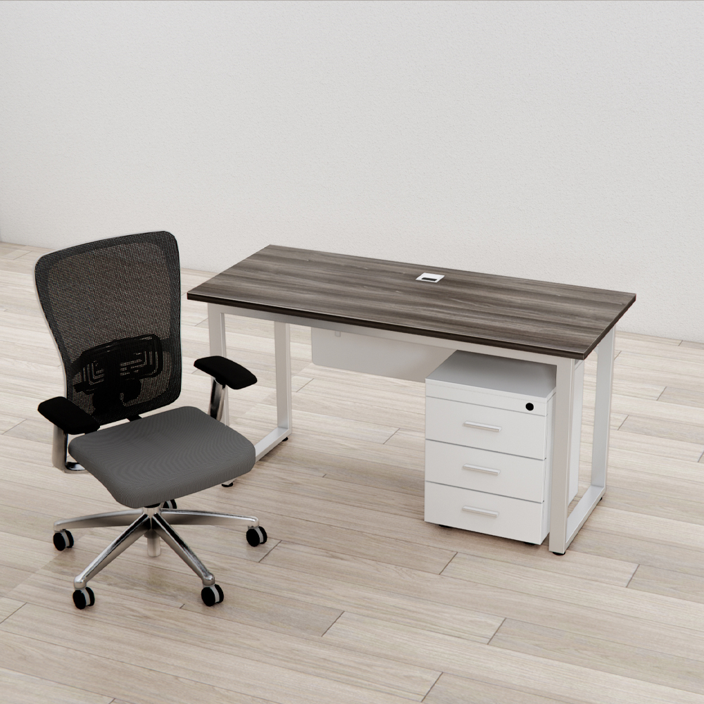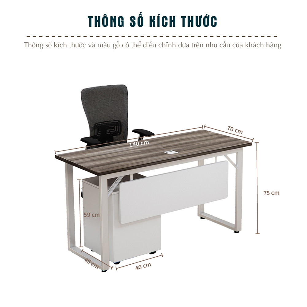 Màu sắc: Mặt bàn màu vân gỗ xám nâu hiện đại, kết hợp khung chân sắt trắng. Có thể tùy chọn màu theo nhu cầu khách hàng.