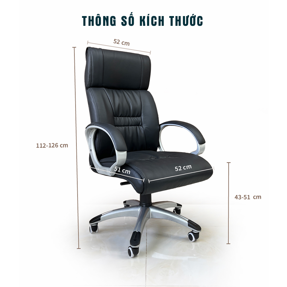 Kích thước tổng thể: Cao 112 – 126 cm, Rộng 52 cm, Sâu đệm ngồi 52 cm