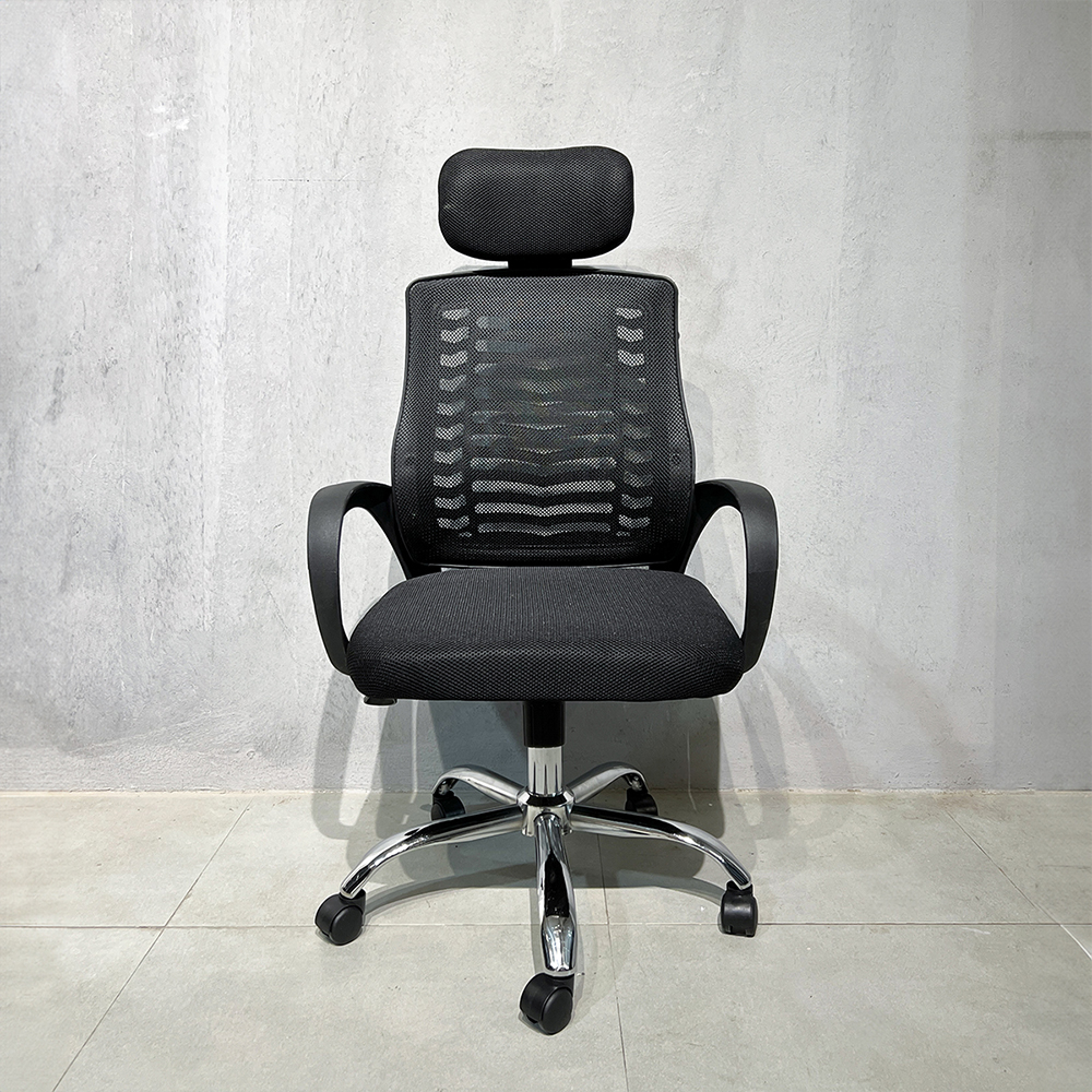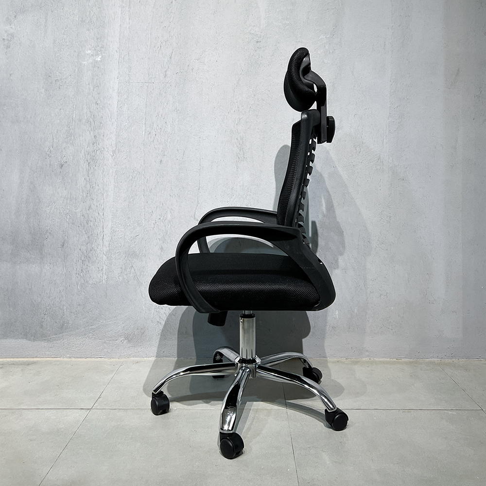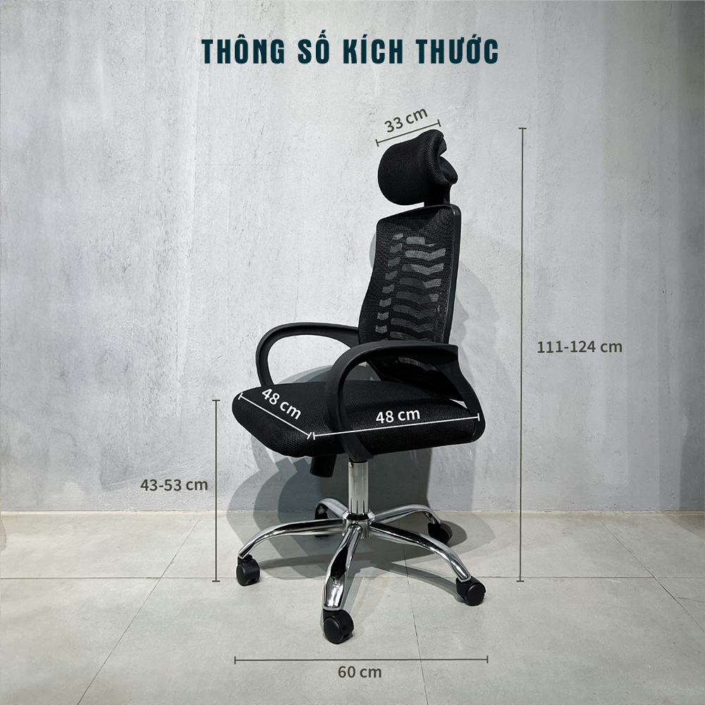 Phần lưng ghế cao kết hợp cùng tựa đầu êm giúp hỗ trợ vùng cổ và vai gáy. Khung ghế từ nhựa PP, chân mạ crom và bánh xe linh hoạt cho phép người dùng xoay chuyển và điều chỉnh chiều cao thuận tiện. Đây là sản phẩm phù hợp cho môi trường làm việc yêu cầu ngồi lâu nhưng vẫn cần sự linh hoạt và tiện nghi.