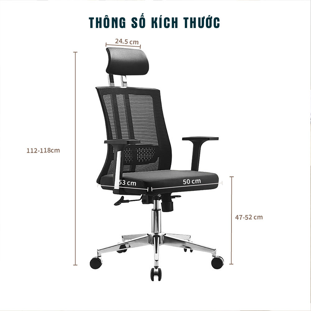 Khả năng tùy chỉnh đa dạng – Nâng hạ, ngả lưng, xoay 360° đáp ứng mọi tư thế làm việc và thư giãn.