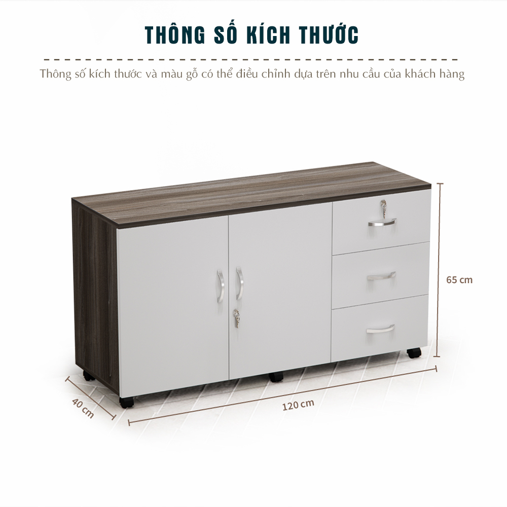 Dung tích lưu trữ lớn: Thiết kế 120cm gồm 3 ngăn kéo và 2 khoang tủ cánh giúp tăng khả năng chứa đựng tài liệu, thiết bị, đồ dùng cá nhân