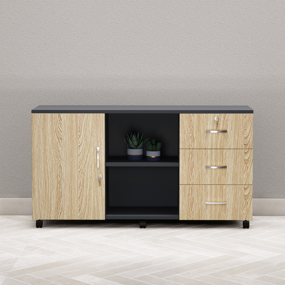 Phân chia chức năng rõ ràng: Gồm 3 ngăn kéo có khóa, 1 tủ cánh mở và 2 kệ trưng bày, đáp ứng đầy đủ nhu cầu lưu trữ tài liệu, vật dụng cá nhân và đồ trang trí