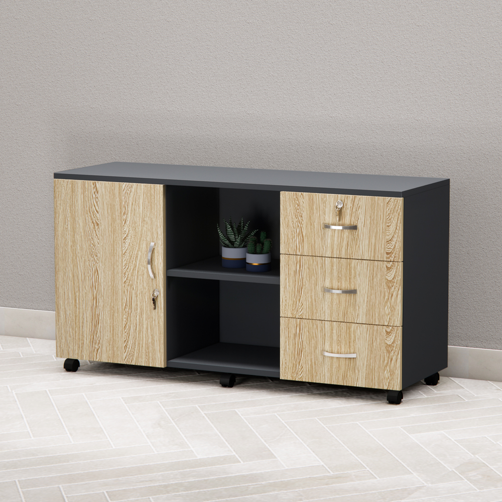 Fergus FGHT08 là mẫu hộc tủ di động cao cấp được thiết kế dài 1m2, phù hợp với nhu cầu lưu trữ đa dạng trong môi trường văn phòng hiện đại. Sản phẩm kết hợp hài hòa giữa 3 ngăn kéo, 1 khoang tủ cánh mở và 2 kệ để đồ, tạo nên không gian sắp xếp tiện lợi, khoa học. Tông màu đen phối vân gỗ sáng giúp dễ dàng kết hợp với nhiều kiểu nội thất khác nhau.
