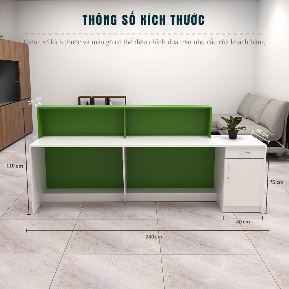 Kích thước quầy cân đối 2m4, dễ lắp đặt tại nhiều loại hình văn phòng, từ không gian startup đến doanh nghiệp có mô hình vận hành bài bản.