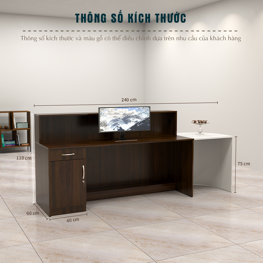 Với kích thước dài 2m4 và chiều sâu bàn phụ mở rộng đến 75cm, sản phẩm cung cấp khu vực tiếp khách linh hoạt, thuận tiện cho cả nhân viên làm việc và khách hàng tương tác.