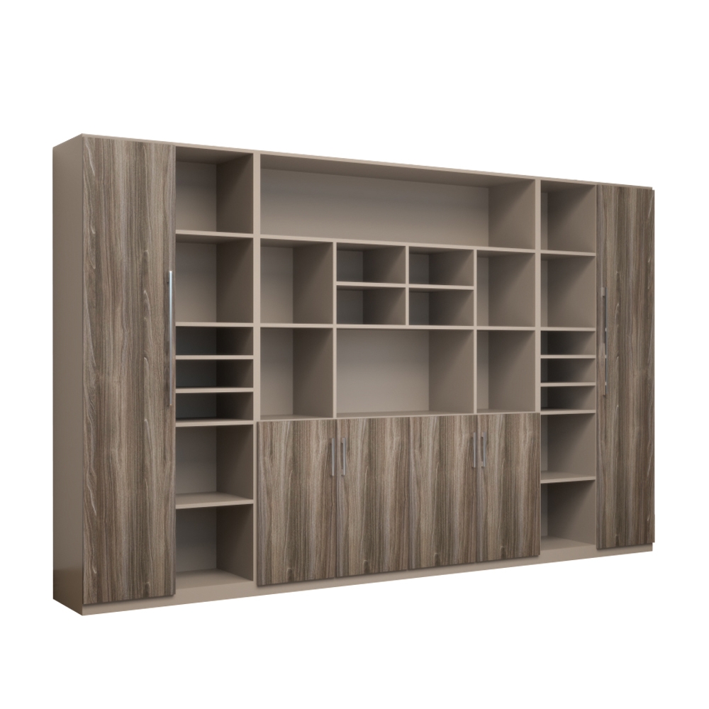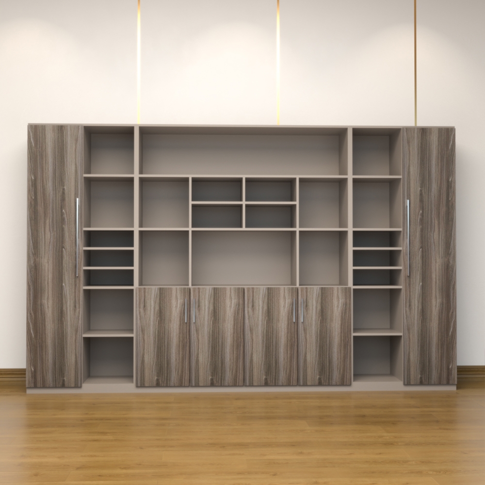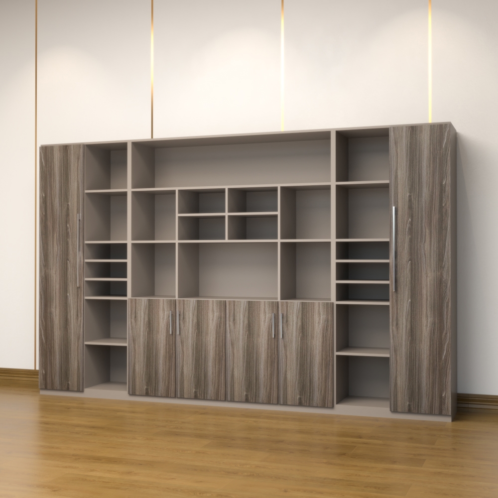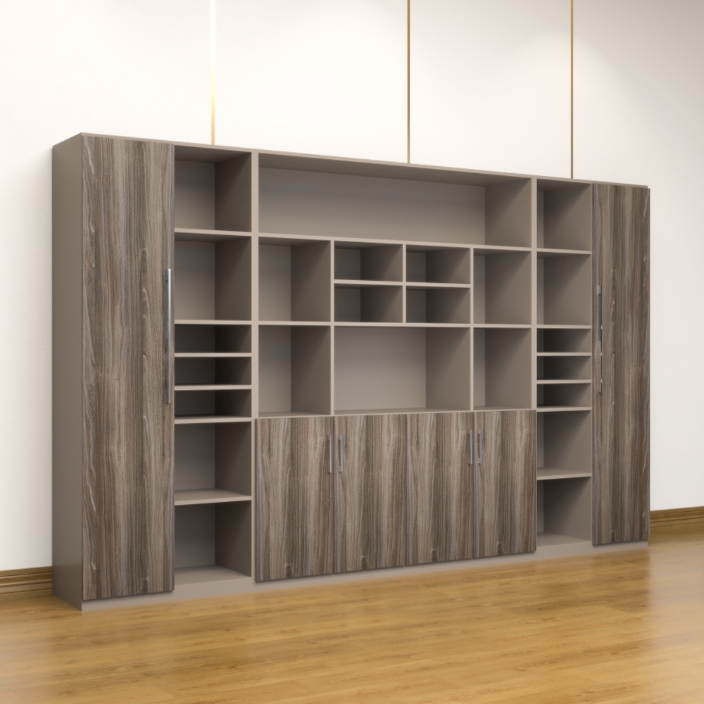 Sản phẩm được thiết kế với kết cấu đối xứng, chia thành nhiều khoang kệ mở ở trung tâm và hai cánh tủ kín hai bên. Màu sắc vân gỗ trầm phối nền be trung tính phù hợp với nhiều kiểu văn phòng khác nhau, từ hiện đại đến tối giản.