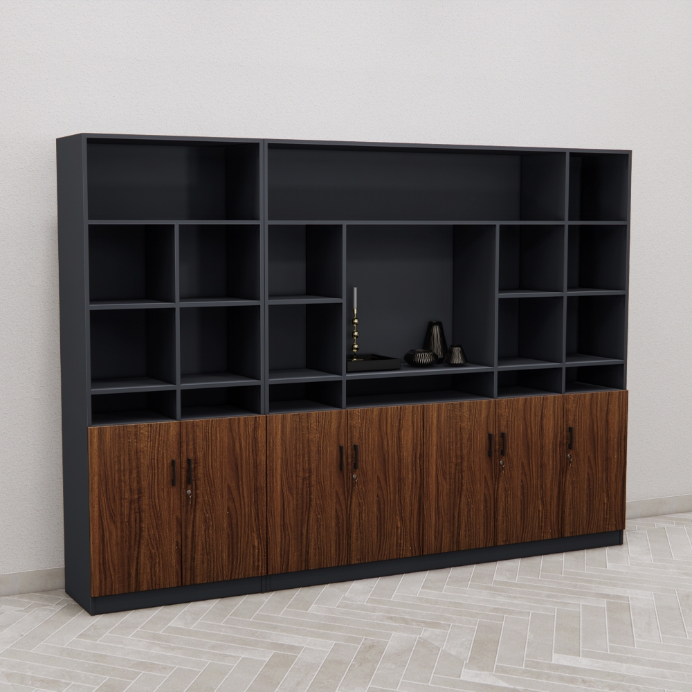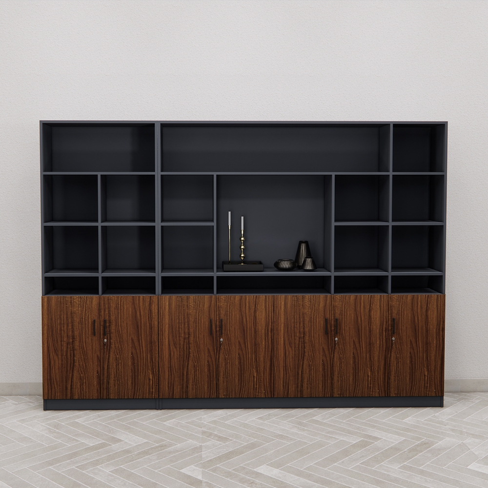 Phần dưới là hệ tủ cánh kín với 7 khoang độc lập, hỗ trợ lưu trữ hồ sơ, tài liệu và vật dụng cần sự riêng tư