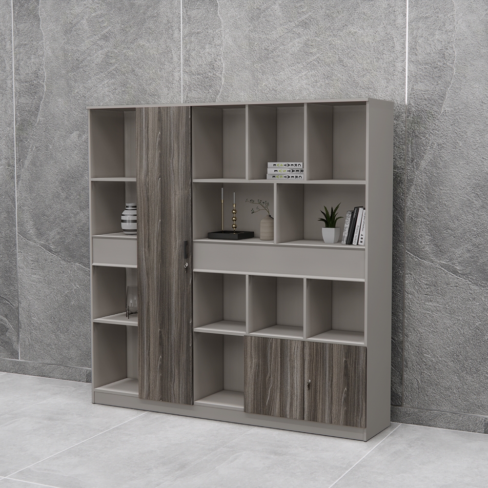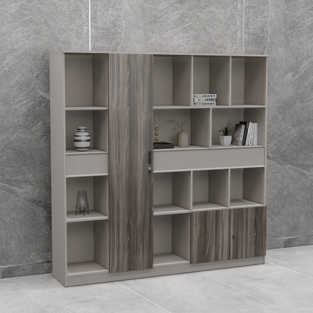 Tông màu ghi sáng phối vân gỗ xám trung tính giúp tủ dễ dàng kết hợp với bàn giám đốc, tủ phụ hoặc các nội thất cùng màu trong văn phòng hiện đại. Kiểu dáng vuông vức, đường nét đơn giản giúp không gian làm việc thêm phần tinh gọn và ngăn nắp.