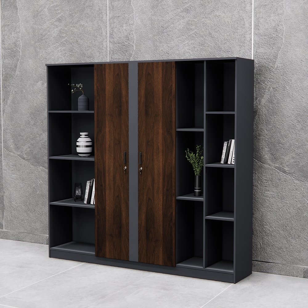 Điểm nhấn của FGTGD053 nằm ở phần phối màu tinh tế giữa tông đen hiện đại và cánh tủ vân gỗ nâu trầm sang trọng. Hai cánh tủ chính được đặt ở trung tâm, tích hợp tay nắm và khóa an toàn. Hai bên là hệ thống kệ mở đa tầng, thuận tiện trong việc trưng bày sách, vật dụng hoặc hồ sơ thường dùng.