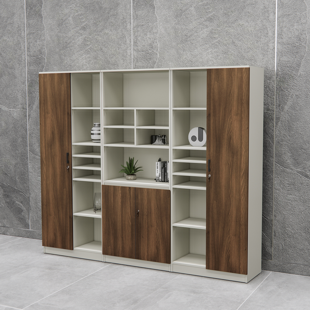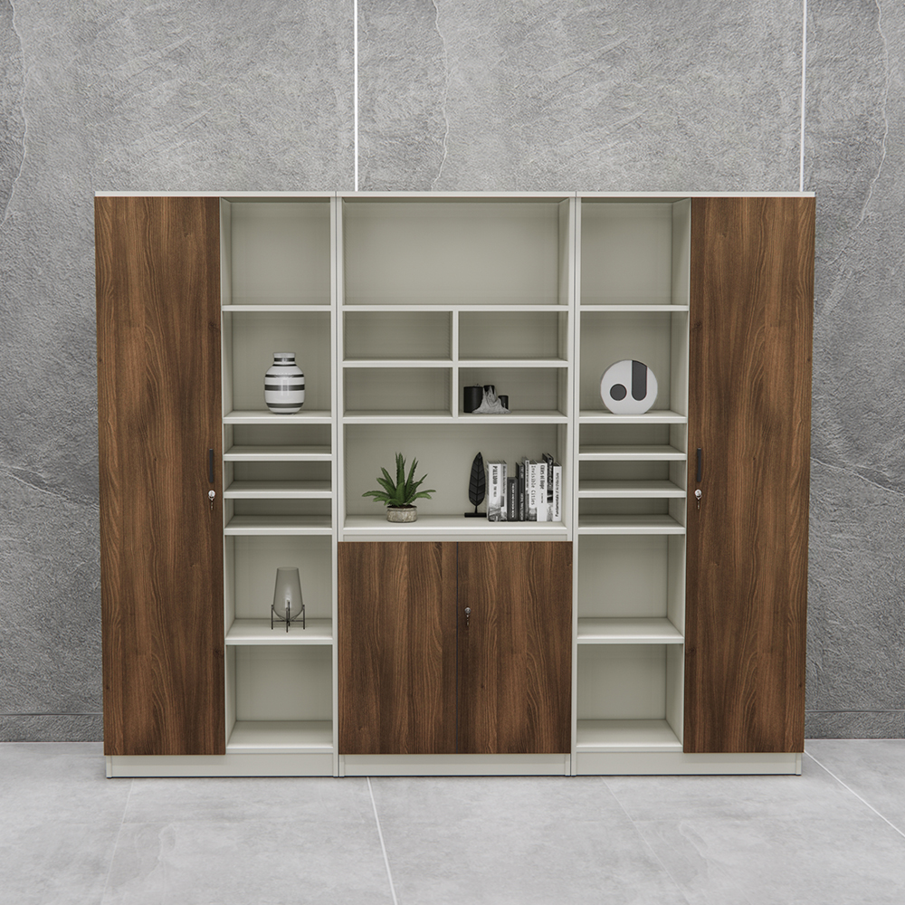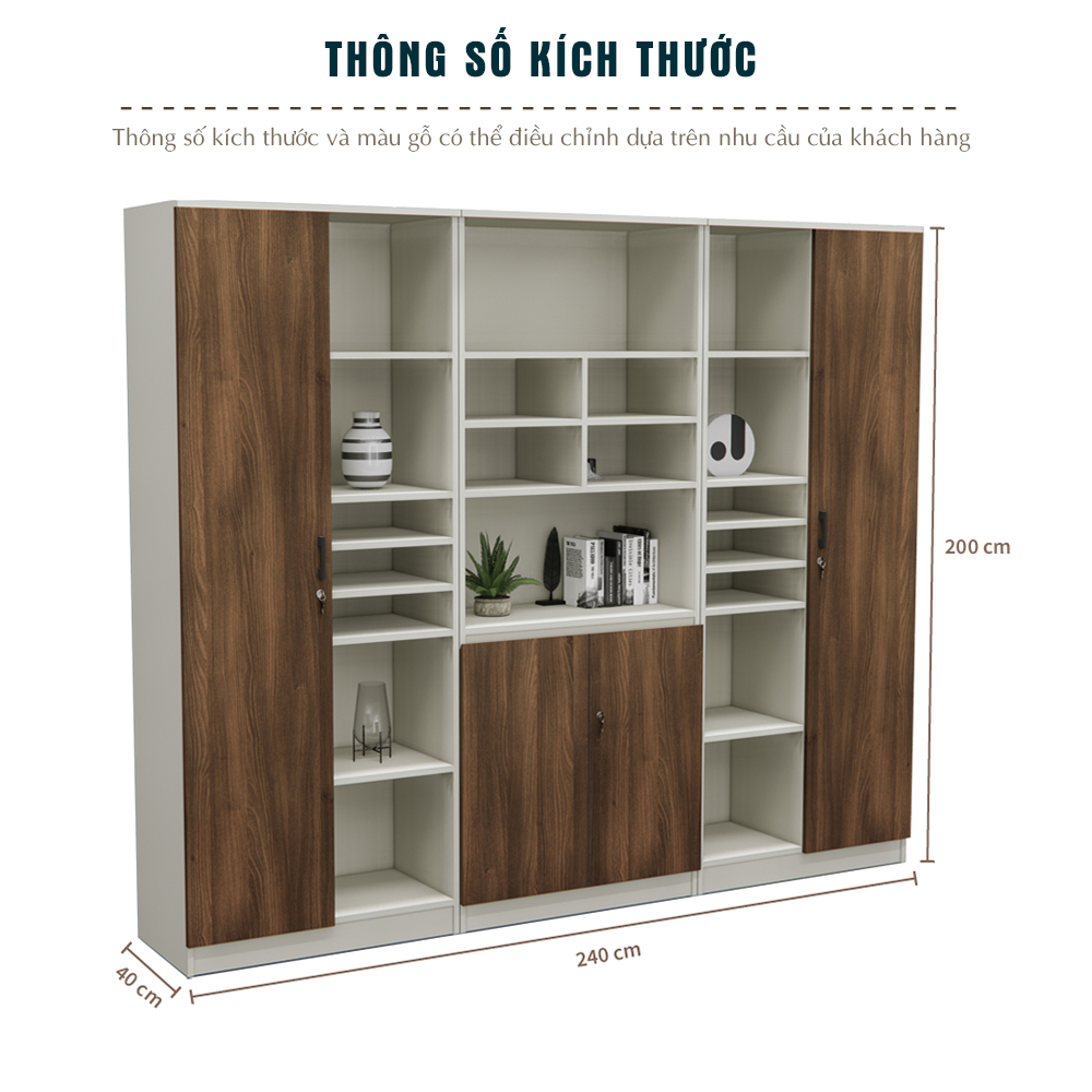Mẫu tủ sử dụng gam màu trắng kem phối cùng cánh tủ vân gỗ nâu trầm, mang lại vẻ hiện đại và hài hòa cho không gian văn phòng. Thiết kế đối xứng, kết hợp giữa kệ mở, hộc ngang và tủ cánh có khóa tạo nên tổng thể cân đối, dễ sử dụng.