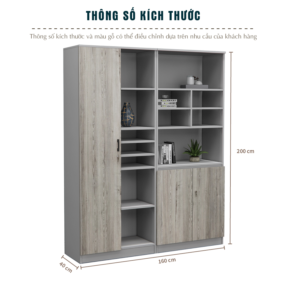 Cấu trúc: Gồm nhiều ngăn kệ mở, hộc tài liệu, tủ cánh kín có khóa