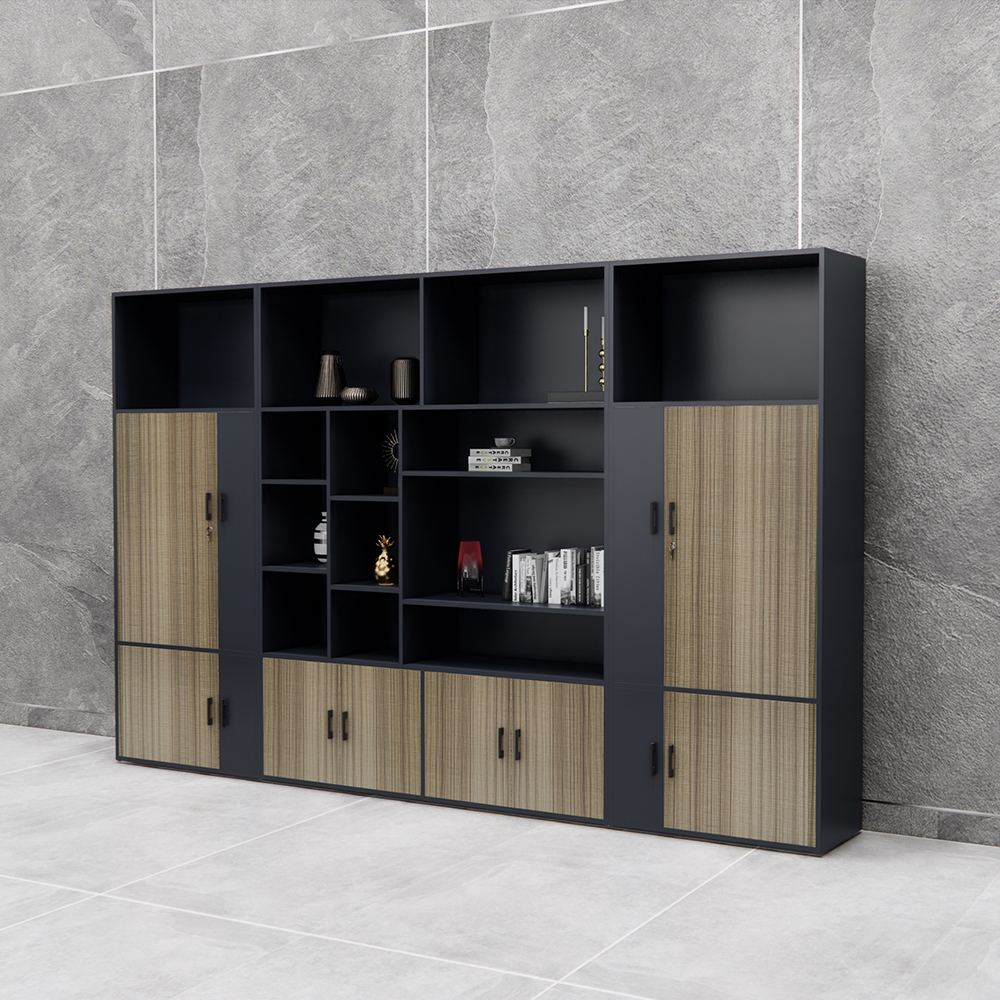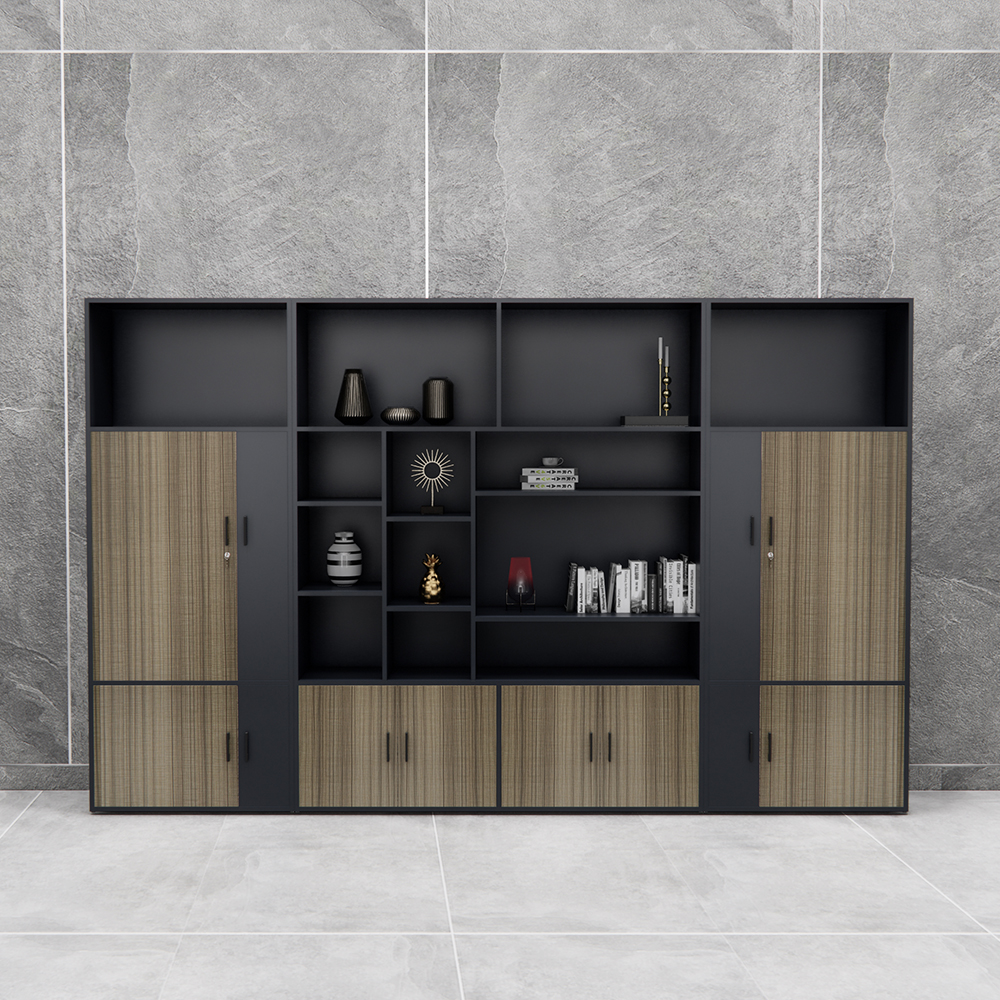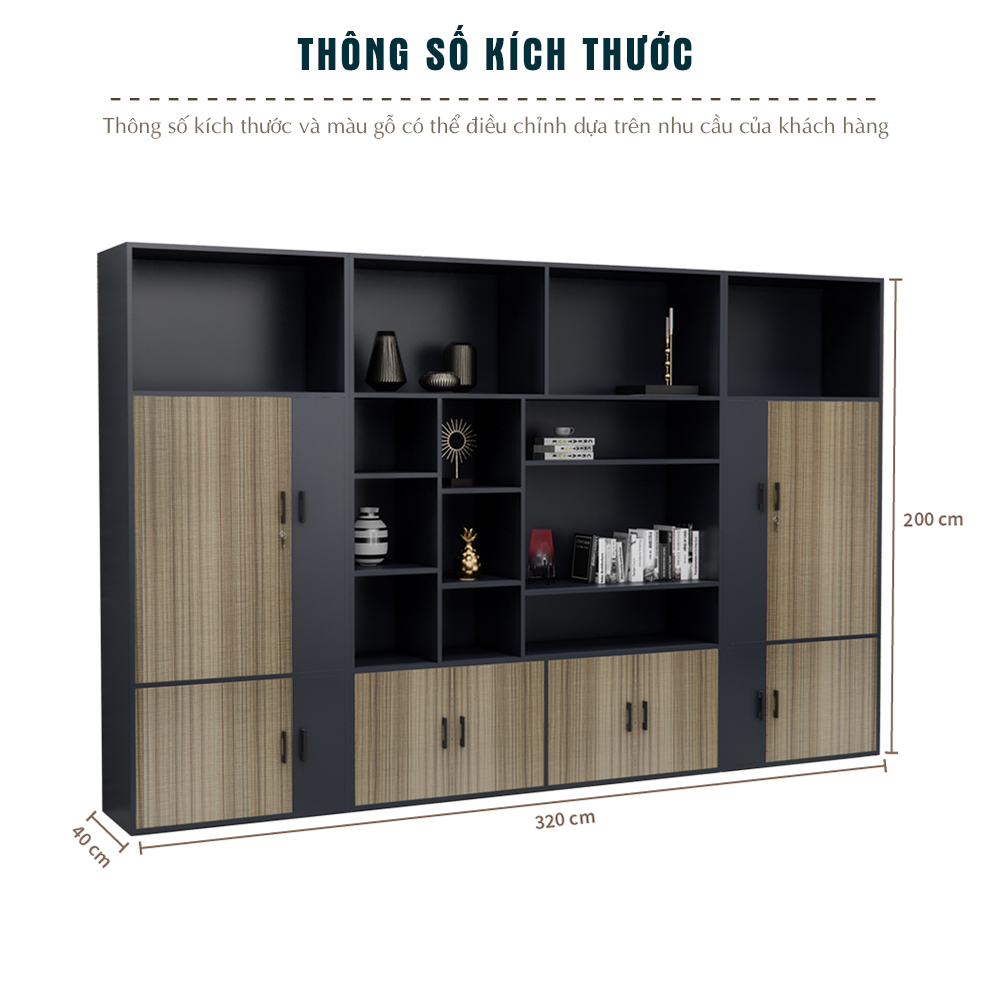 Kết cấu thông minh: Hệ tủ chia làm nhiều khoang rõ ràng, bao gồm kệ mở trưng bày và tủ cánh để tài liệu, thiết bị, giúp tối ưu không gian làm việc