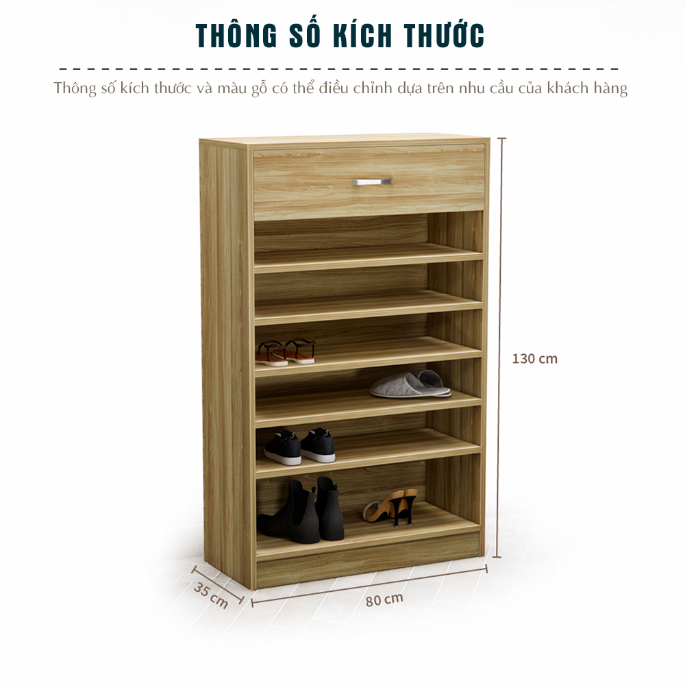 Thiết kế: 7 tầng kệ mở thông thoáng, phía trên có 1 ngăn kéo để phụ kiện hoặc vật dụng nhỏ