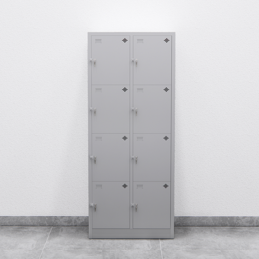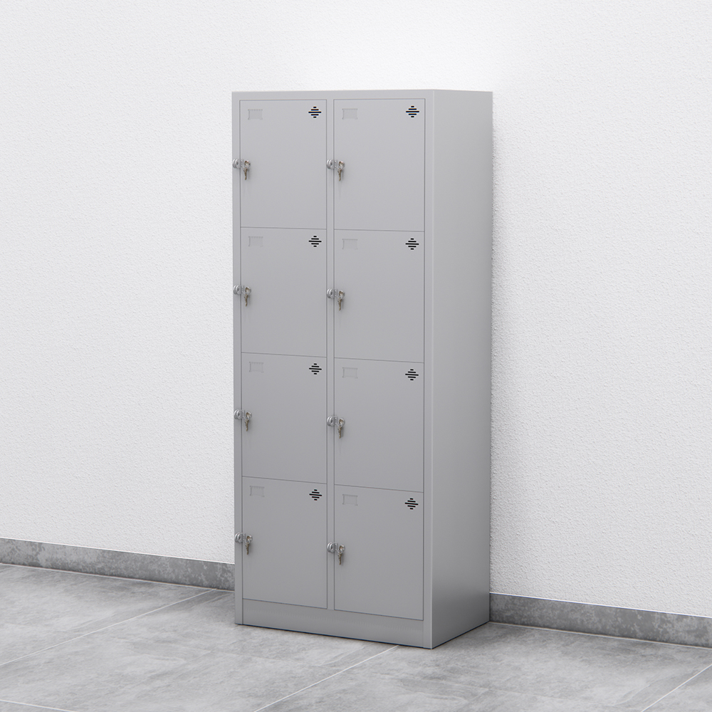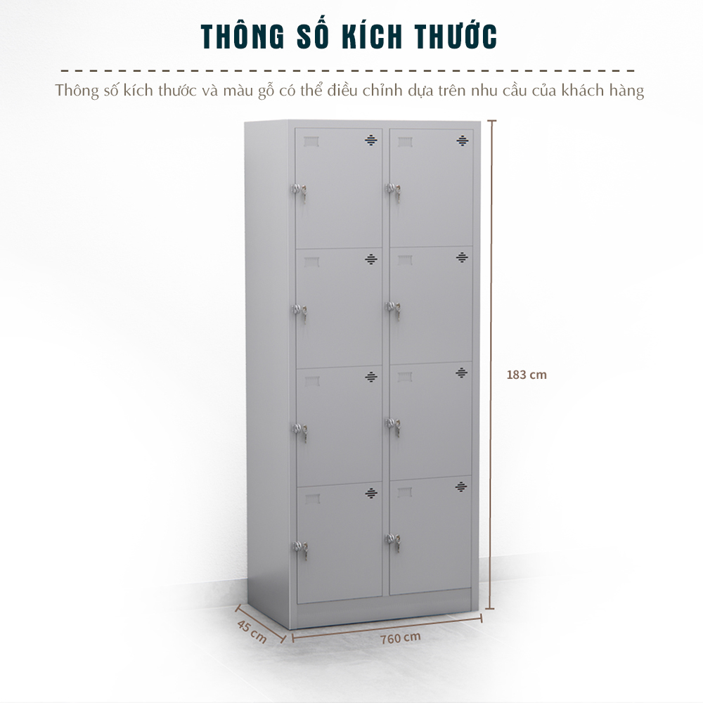 Thiết kế: 8 khoang chia đều 2 cột × 4 tầng; mỗi ngăn có tay nắm và khóa cơ riêng